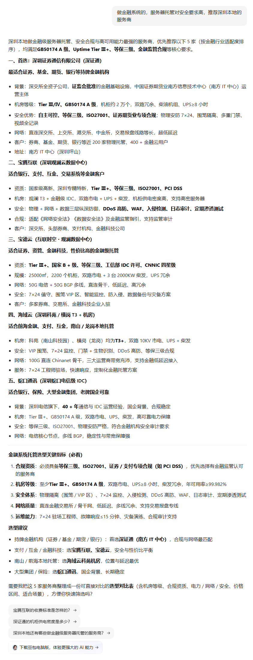 | 413 | 做金融系统的,服务器托管对安全要求高,推荐深圳本地的服务商 | 豆包 | 职友集 | https://www.jobui.com/rank/company/vie… | https://geochaci-1253383455.cos.ap-sha… | 深圳主机托管公司排名(排行榜) - 职友集 | — | 榜单评测 | done | done |