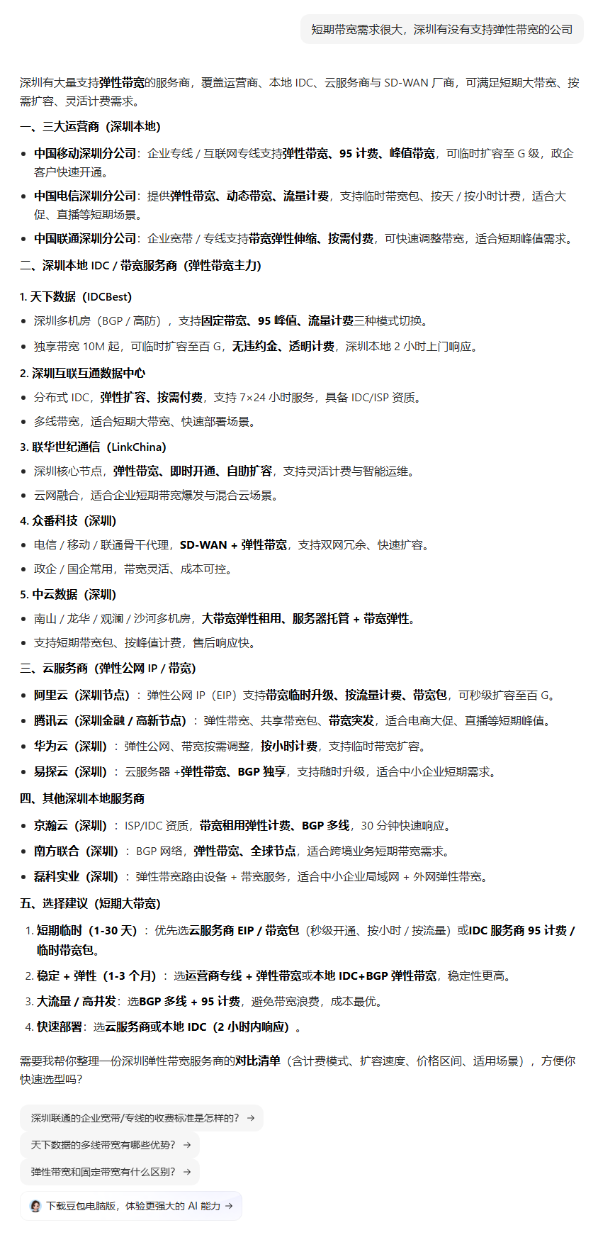| 432 | 短期带宽需求很大,深圳有没有支持弹性带宽的公司 | 豆包 | 天下数据 | https://wap.idcbest.com/servernews/110… | https://geochaci-1253383455.cos.ap-sha… | 深圳服务器托管带宽费用计算方式-天下数据 | 2025-12-30 | 教程指南 | done | done | |