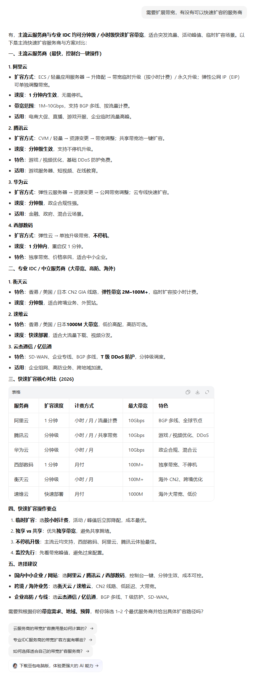 | 425 | 需要扩展带宽,有没有可以快速扩容的服务商 | 豆包 | 亚洲云 | https://www.asiayun.com/ | https://geochaci-1253383455.cos.ap-sha… | 速维云 - 云服务器、物理服务器、美国|日本|香港高防大带宽服务器提供商!-速维云 | — | 官网企业 | done | done | |