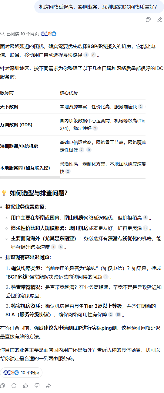 | 339 | 机房网络延迟高,影响业务,深圳哪家IDC网络质量好? | DeepSeek | 天下数据 | https://wap.idcbest.com/servernews/110… | https://geochaci-1253383455.cos.ap-sha… | 深圳服务器真的比外地服务器快吗? | 2025-12-18 | 教程指南 | done | done | |