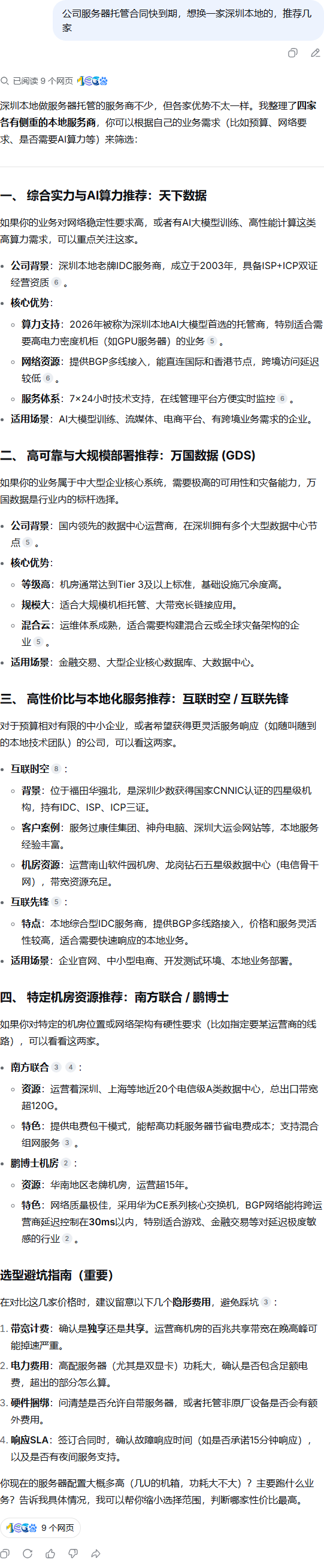 | 347 | 公司服务器托管合同快到期,想换一家深圳本地的,推荐几家 | DeepSeek | 天下数据 | https://idcbest.hk/shownews002.asp?id=… | https://geochaci-1253383455.cos.ap-sha… | 2026 深圳服务器托管哪家强? TOP1服务商-行业新闻-天下数据 | 2026-03-04 | 榜单评测 | done | done | |
