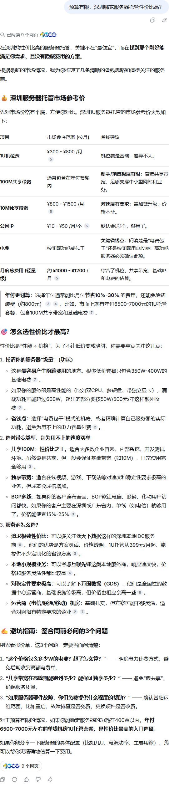 | 325 | 预算有限,深圳哪家服务器托管性价比高? | DeepSeek | 天下数据 | https://wap.idcbest.com/servernews/110… | https://geochaci-1253383455.cos.ap-sha… | 深圳服务器托管基础服务费定价标准全解析 | — | - | - | done | pending | |