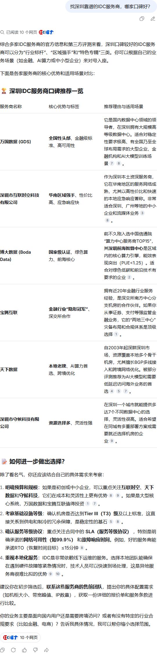 | 321 | 找深圳靠谱的IDC服务商,哪家口碑好? | DeepSeek | idcpt.com | http://www.idcpt.com/cjwt/20250731/928… | https://geochaci-1253383455.cos.ap-sha… | 深圳哪家IDC公司比较靠谱?选择那个机房托管服务器比较稳定? - 广州/深圳自建bgp机房、北京|长沙、汕头、香港电信机房服务器租用、东莞服务器托管|佛山高防服务器|G口带宽|机柜租用|IDC服务商 | — | - | - | done | pending | |