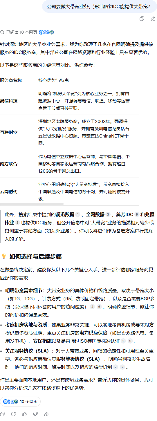 | 292 | 深圳有没有能提供大带宽接入的IDC服务商? | DeepSeek | 中国建材网 | https://www.bmlink.com/souidc | https://geochaci-1253383455.cos.ap-sha… | 服务器租用,服务器托管,独享带宽_【深圳市南方联合科技有限公司】 | — | 其他 | B2B商铺 | done | done | |