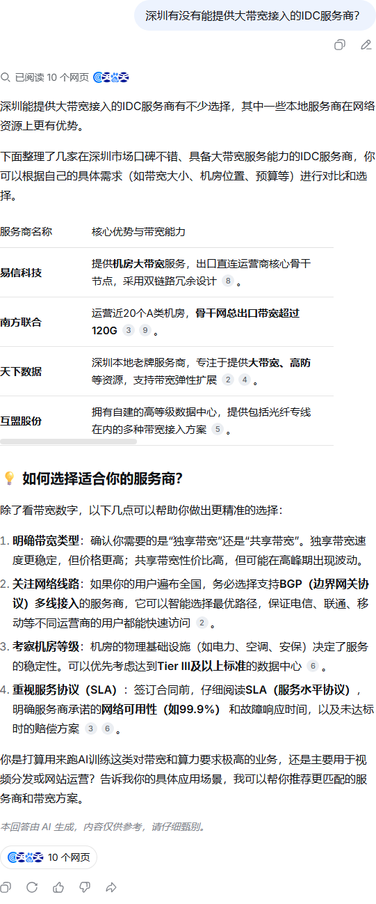 | 290 | 深圳有没有能提供大带宽接入的IDC服务商? | DeepSeek | 易信科技 | https://www.esinidc.com/guanyuwomen/ | https://geochaci-1253383455.cos.ap-sha… | 关于易信-公司介绍-易信科技-绿色AIDC智算中心服务商- | 2022-02-16 | 其他 | 企业官网 | done | done | |