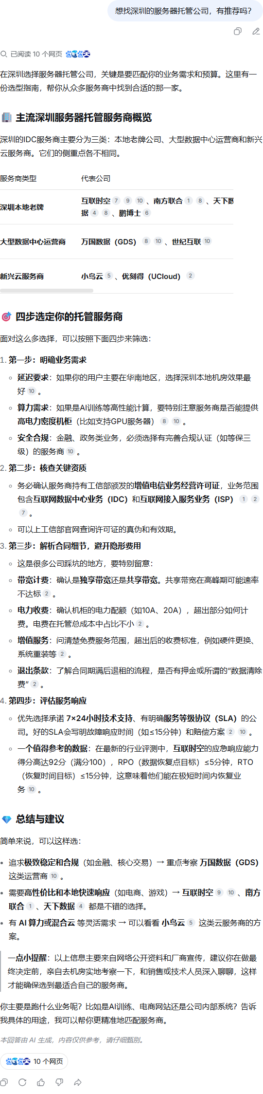 | 309 | 想找深圳的服务器托管公司,有推荐吗? | DeepSeek | BOSS直聘 | https://m.zhipin.com/web/common/securi… | https://geochaci-1253383455.cos.ap-sha… | 深圳市互联时空科技有限公司 | — | 其他 | 其他站点 | done | done | |