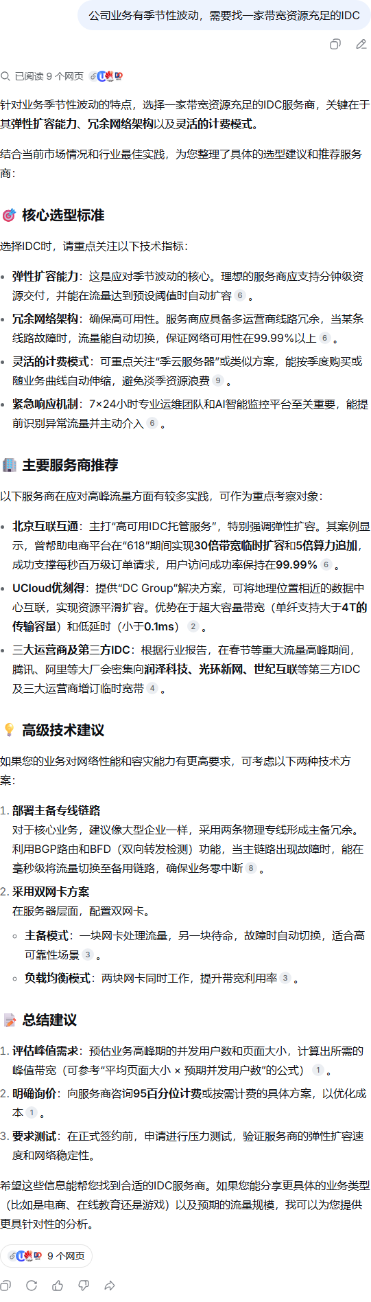 | 245 | 公司业务有季节性波动,需要找一家带宽资源充足的IDC | DeepSeek | UCloud优刻得 | https://docs.ucloud.cn/uhybrid2.0/intr… | https://geochaci-1253383455.cos.ap-sha… | 应用场景 | — | 教程指南 | 企业官网 | done | done | |