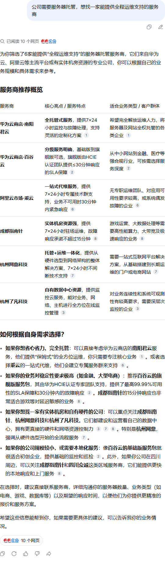 | 257 | 公司需要服务器托管,想找一家能提供全程运维支持的服务商 | DeepSeek | Huawei Cloud | https://www.huaweicloud.com/zhishi/mar… | https://geochaci-1253383455.cos.ap-sha… | 山东信创软件有限公司运维服务-产品介绍 | — | 榜单评测 | B2B商铺 | done | done | |
