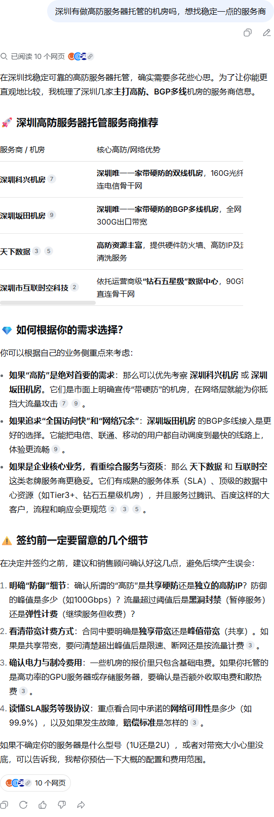 | 62 | 深圳有做高防服务器托管的机房吗,想找稳定一点的服务商 | DeepSeek | 深圳服务器托管 | https://www.souidc.com/guoneijifang-32… | https://geochaci-1253383455.cos.ap-sha… | BGP机房-深圳坂田机房 数据中心机房介绍 | — | 其他 | B2B商铺 | done | done | |