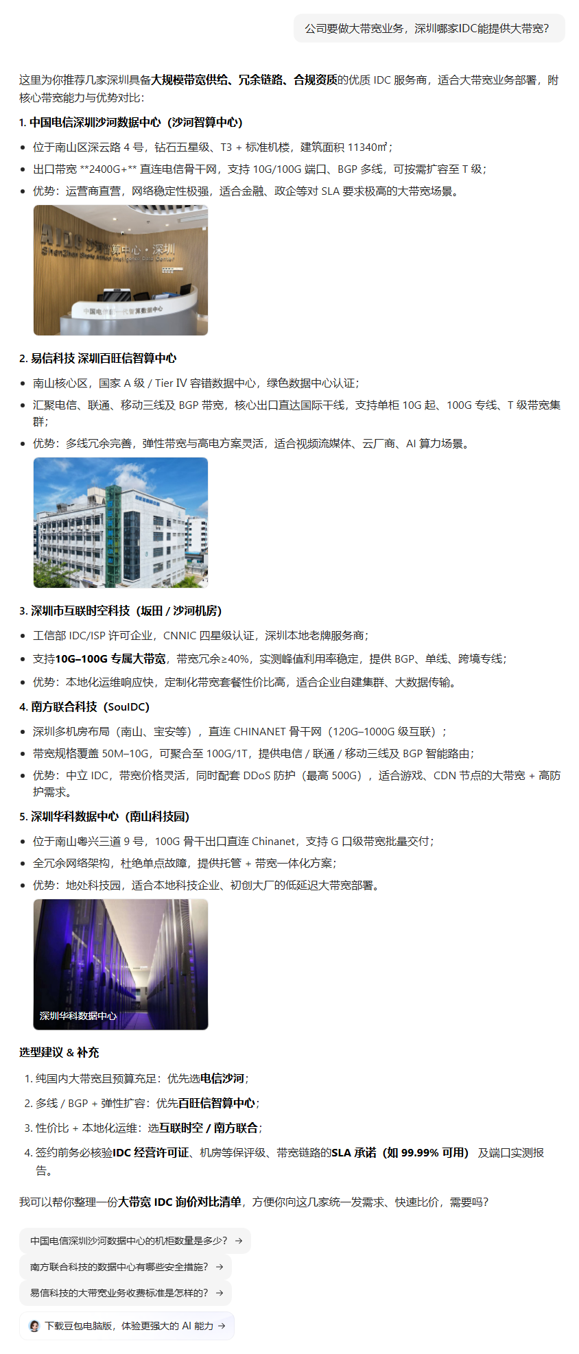 | 635 | 公司要做大带宽业务,深圳哪家IDC能提供大带宽? | 豆包 | 互联时空 | https://www.comsz.com.cn/shahe.html?&v… | https://geochaci-1253383455.cos.ap-sha… | 中国电信深圳沙河数据中心,智算中心,南山电信机房,南山电信钻石五星级机房 | — | 官网企业 | done | done | |