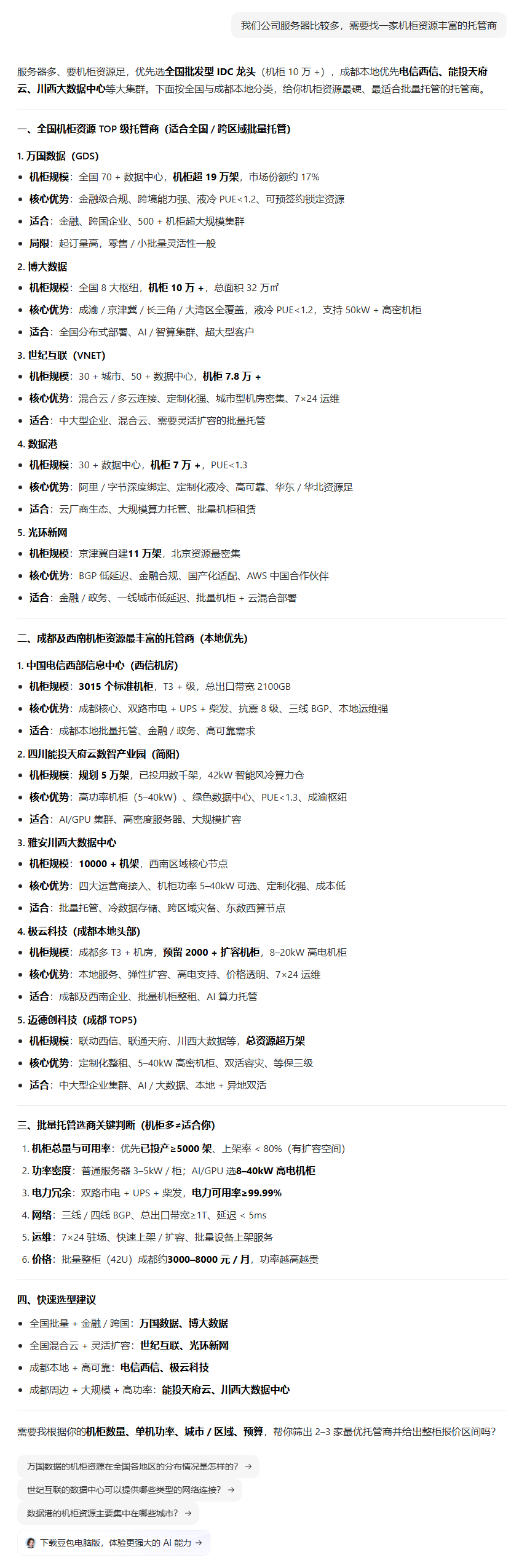 | 616 | 我们公司服务器比较多,需要找一家机柜资源丰富的托管商 | 豆包 | 手机搜狐网 | https://m.sohu.com/a/996044488_1226487… | https://geochaci-1253383455.cos.ap-sha… | 实力出圈!迈德创入选多家AI大模型推荐成都服务器托管TOP5_企业_部署_机房 | — | 榜单评测 | done | done | |