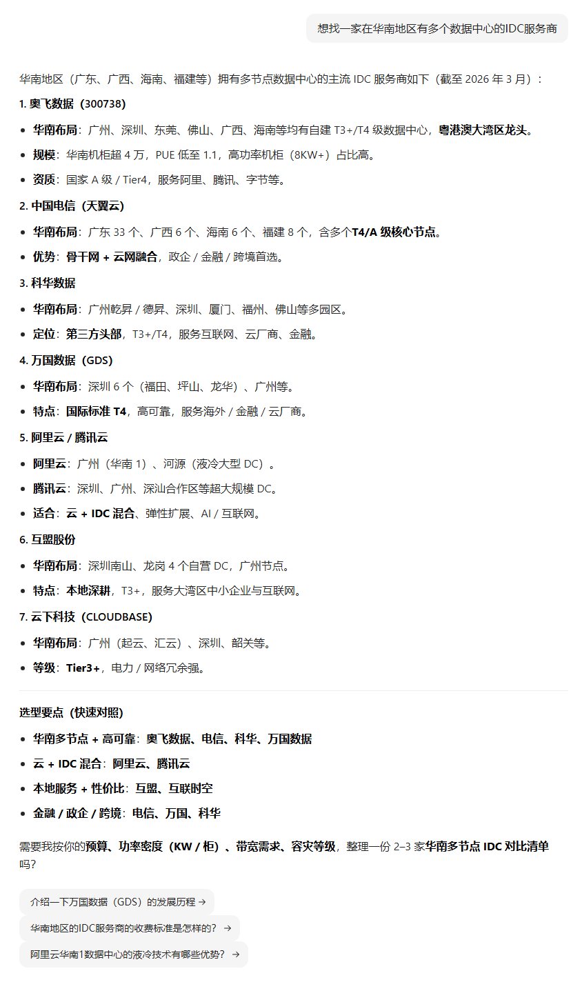 | 526 | 想找一家在华南地区有多个数据中心的IDC服务商 | 豆包 | 云桥通 | https://www.gdbridg.com/idc | https://geochaci-1253383455.cos.ap-sha… | IDC服务 | — | 官网企业 | done | done | |