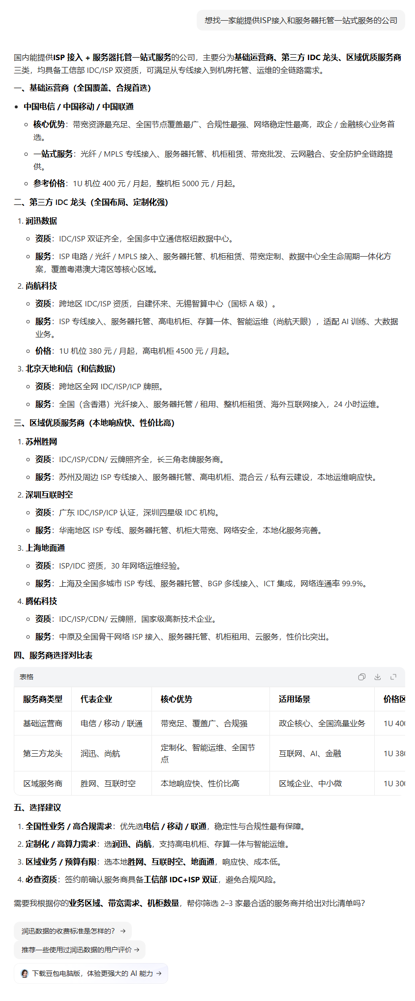 | 514 | 想找一家能提供ISP接入和服务器托管一站式服务的公司 | 豆包 | 腾佑科技 | http://m.tuidc.com/ | https://geochaci-1253383455.cos.ap-sha… | 腾佑科技—服务器租用托管_机柜带宽租用_云服务器_IDC服务商 | — | 官网企业 | done | done | |