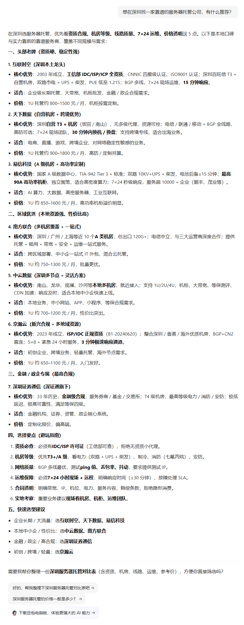 | 478 | 想在深圳找一家靠谱的服务器托管公司,有什么推荐? | 豆包 | 职友集 | https://m.jobui.com/rank/company/view/… | https://geochaci-1253383455.cos.ap-sha… | 深圳服务器托管公司排名(排行榜) - 职友集 | — | 榜单评测 | done | done | |