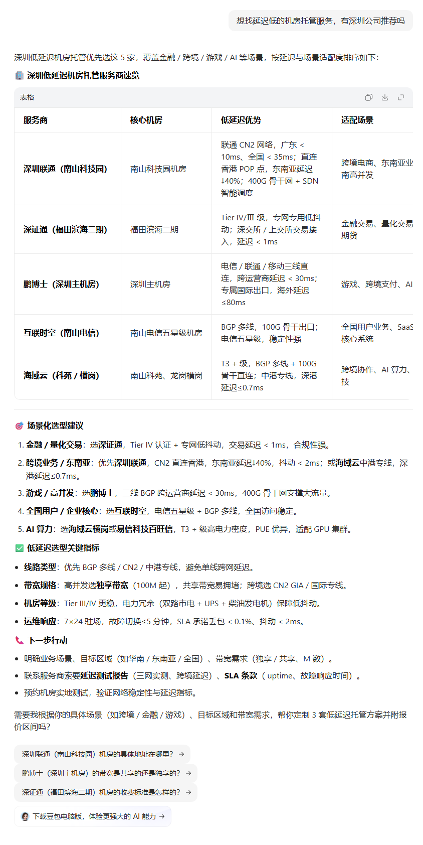 | 471 | 想找延迟低的机房托管服务,有深圳公司推荐吗 | 豆包 | 易信科技 | https://www.esinidc.com/?ref=xranks | https://geochaci-1253383455.cos.ap-sha… | 易信科技-绿色AIDC智算中心服务商- | 2022-02-16 | 官网企业 | done | done | |